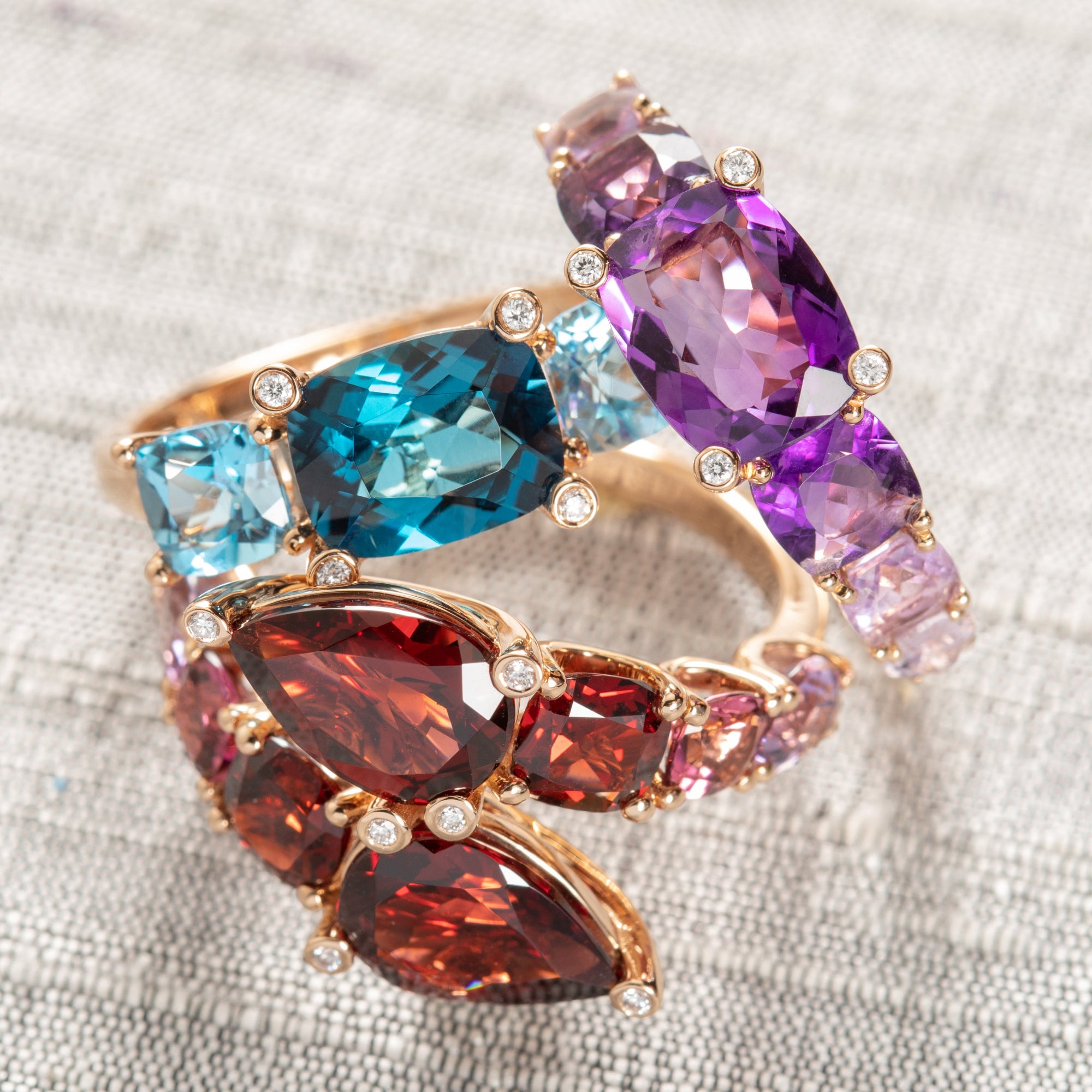 Topazi, citrini, ametiste, granati e diamanti sono i protagonisti della collezione Iris by Ponte Vecchio Gioielli. Tagli e colori dégradé la rendono espressiva ed unica come ogni donna.