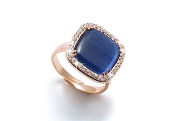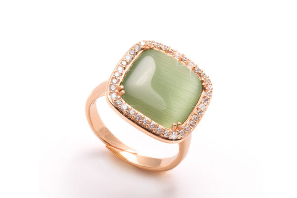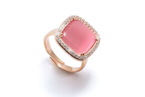 Anello realizzato in argento 925 con galvanica in oro rosa impreziosito con quarzi idrotermali e pavé di zirconi a contorno. Misura regolabile.