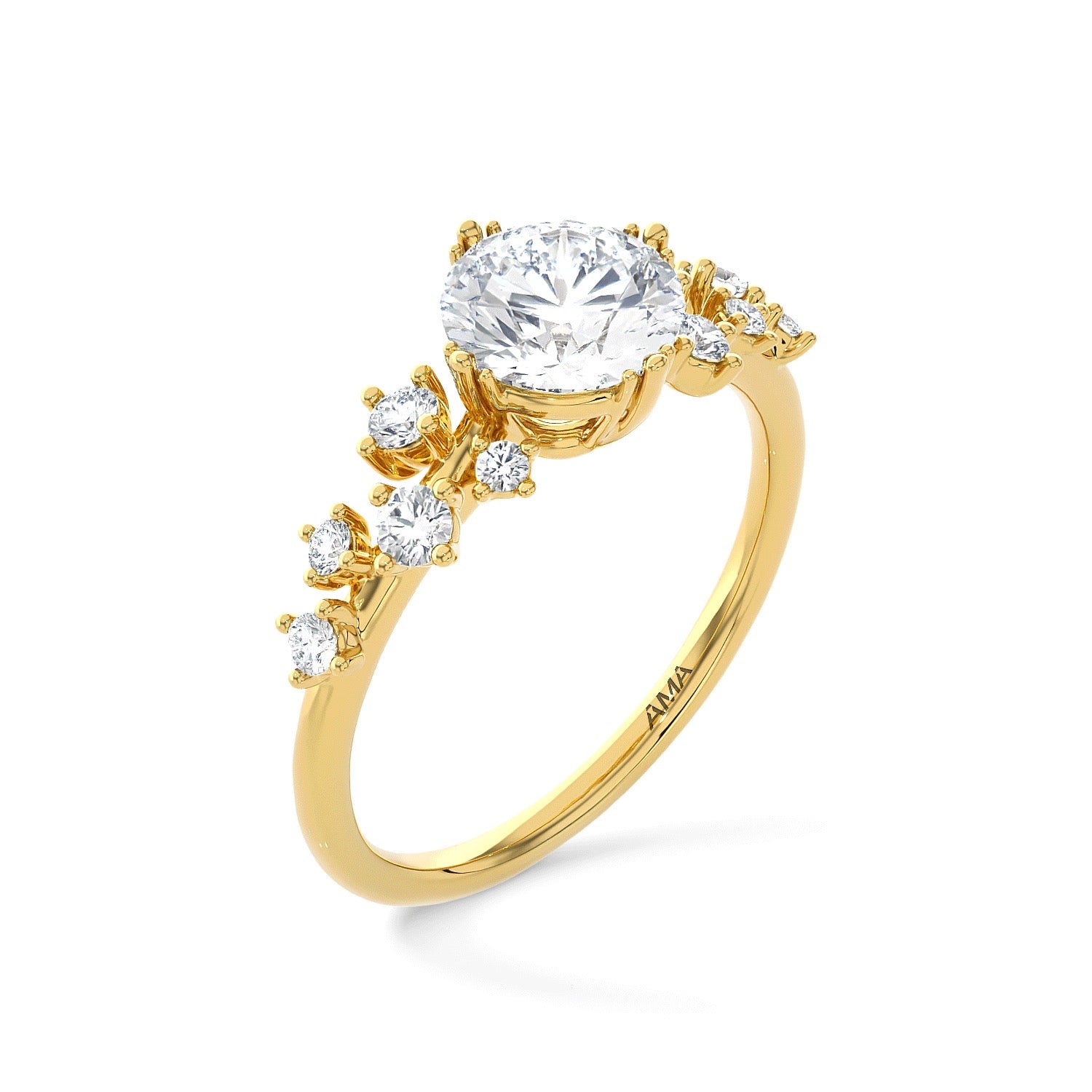 Anello realizzato in oro giallo riciclato 18kt impreziosito con diamanti lab grown per una caratura totale di 1.30 ct. Diamante centrale CT 1,00 D/VS1. I diamanti AMA sono diamanti creati dall'uomo, qualità minima garantita F/VS. Tutti i diamanti superiori a 0,50 ct sono accompagnati da certificato internazionale gemmologico IGI.