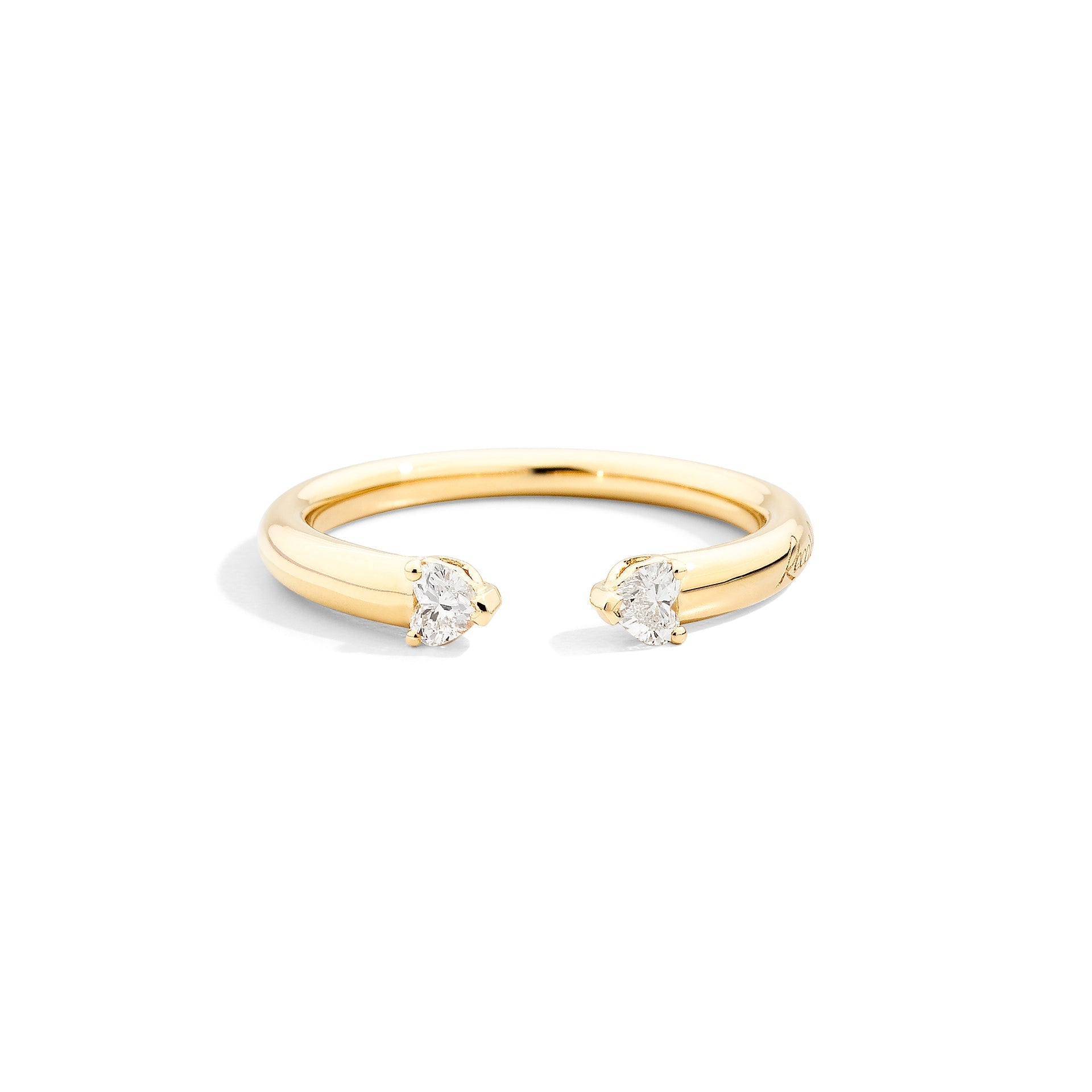 Anello aperto realizzato in oro giallo 18 kt impreziosito con due diamanti taglio brillante forma cuore CT 0,20. Qualità F/VS.