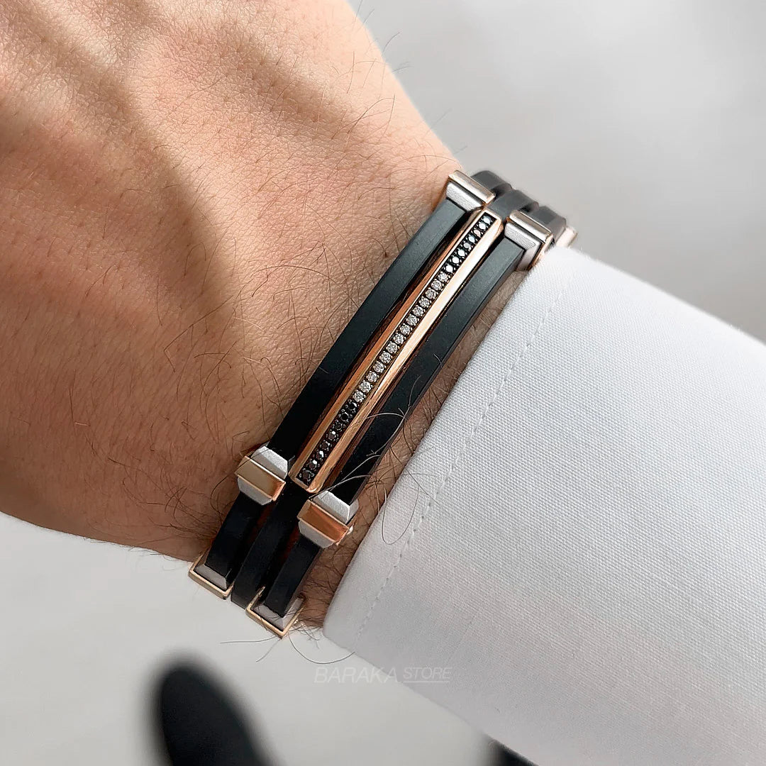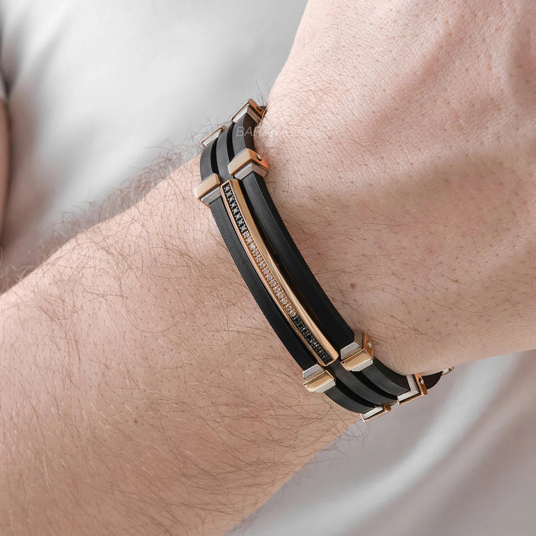 Bracciale realizzato in caucciu e acciaio inossidabile impreziosito con argento, oro rosa 18kt, diamanti neri e bianchi. Diamante bianco nella chiusura.
