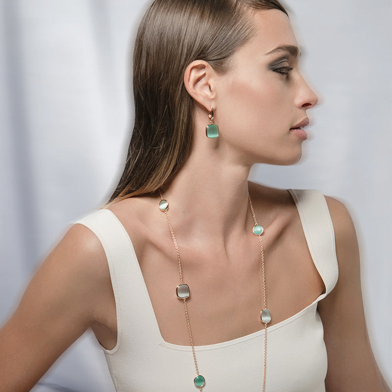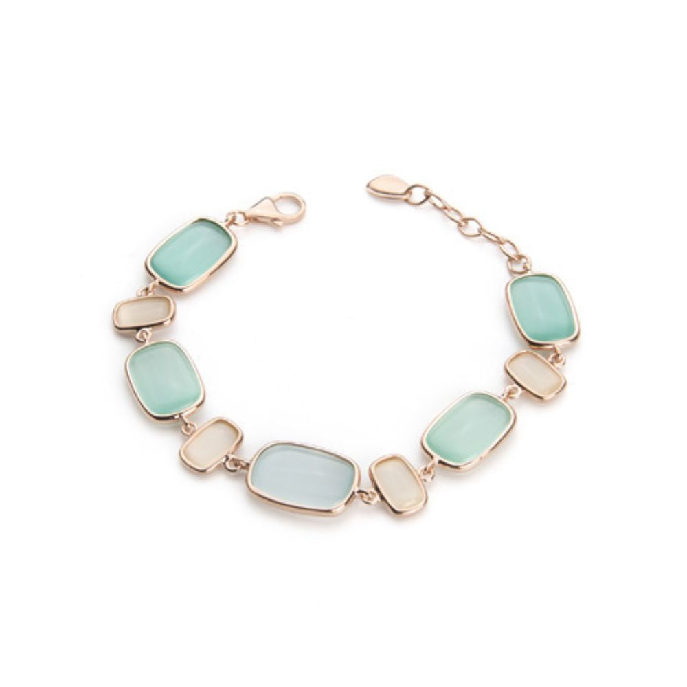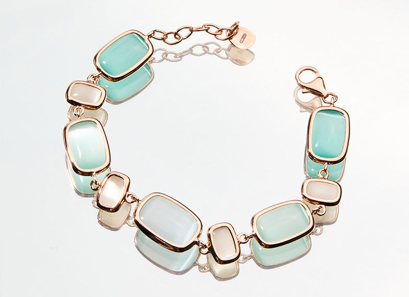 Bracciale Madì in argento 925 con placcatura in oro rosa impreziosito con quarzi idrotermali che richiamano le sfumature delicate del mare, creando un effetto luminoso e armonioso al polso.