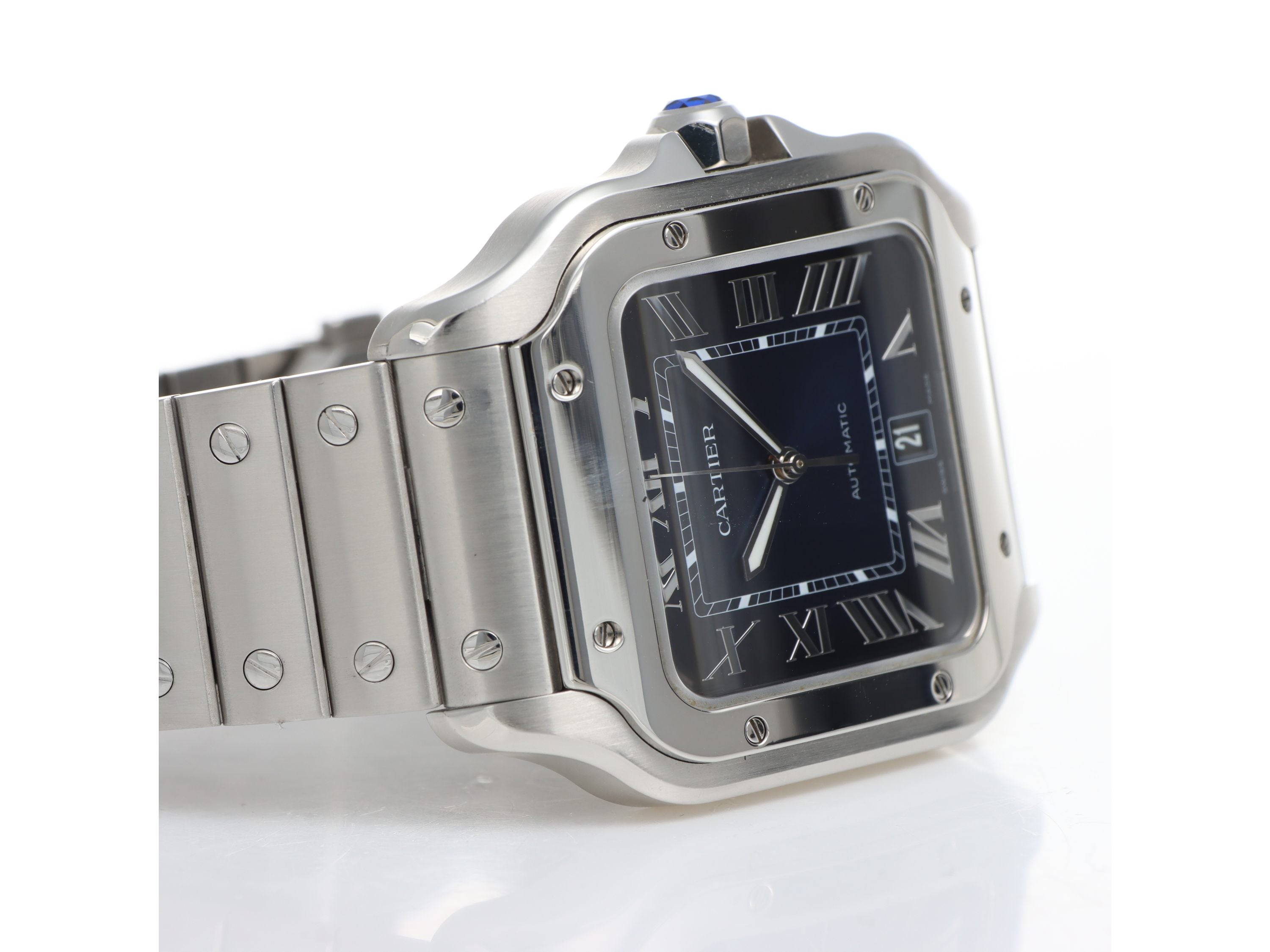 Cartier Santos Large Ref. WSSA0030 realizzato in acciaio, Quadrante blu con numeri romani, Cassa 39,8. Datario ad ore 6. Bracciale in acciaio con chiusura deployanté.