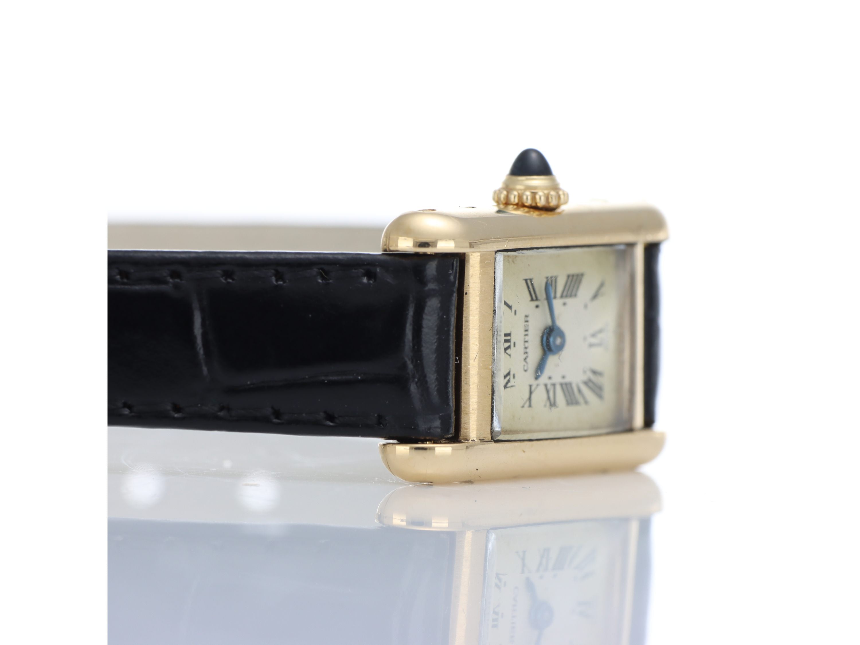 Cartier Tank Mini Ref. 828001 realizzato in oro giallo 18Kt, Quadrante bianco con numeri romani, Cassa 15 x 24. Cinturino in pelle nera con fibbia after. Movimento al quarzo. Orologio in buone condizioni. Anno 1990 (approssimativo).