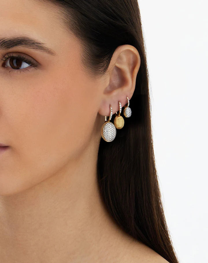 La superfice dorata e irregolare incisa a mano dagli artigiani Nanis con uno speciale bulino millerighe crea insieme ai diamanti un fantastico gioco di luci. Le ciliegine sono perfette per un look elegante quanto casual.