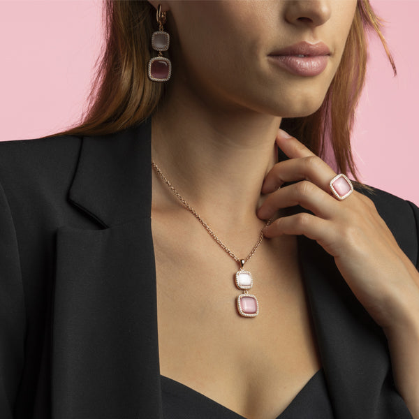 Collana realizzata in argento 925 con galvanica in oro rosa impreziosita con quarzi ecologici idrotermali color ciliegia e pavé di zirconi