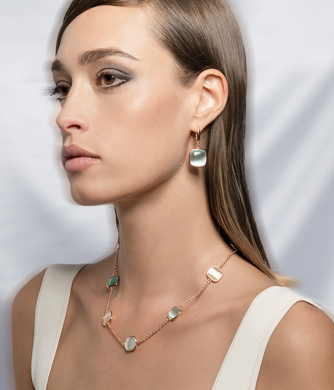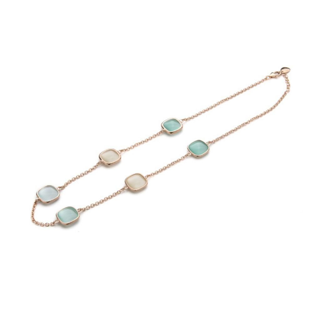 Collana Madì in argento 925 con placcatura in oro rosa impreziosita con quarzi idrotermali in quattro delicate sfumature si alternano creando un gioco di colori unico e luminoso.
