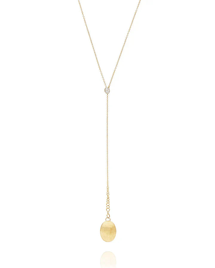 Una delicata boule in oro 18kt incisa a mano coronata da gocce di diamanti danno vita ad un pendente semplice e sofisticato allo stesso tempo, e che soprattutto nasconde un livello di versatilità estremo. Un piccolo anello in oro posizionato nel retro e un apposito foro passante all’interno della boule in diamanti permettono infatti di regolare la collana in tantissimi modi diversi, aprendo questo gioiello a innumerevoli possibilità di interpretazione.