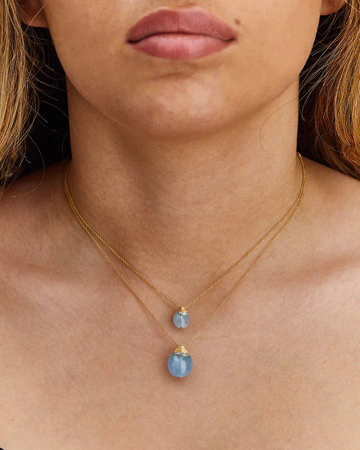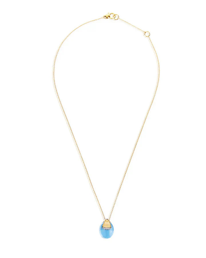 Raffinata collana in oro 18kt e acquamarina milky coronata da eleganti dettagli di diamanti. La sofisticata lavorazione in oro gioca con la luce e con la pietra naturale, nota anche per la sua capacità di favorire la crescita interiore e l’introspezione.