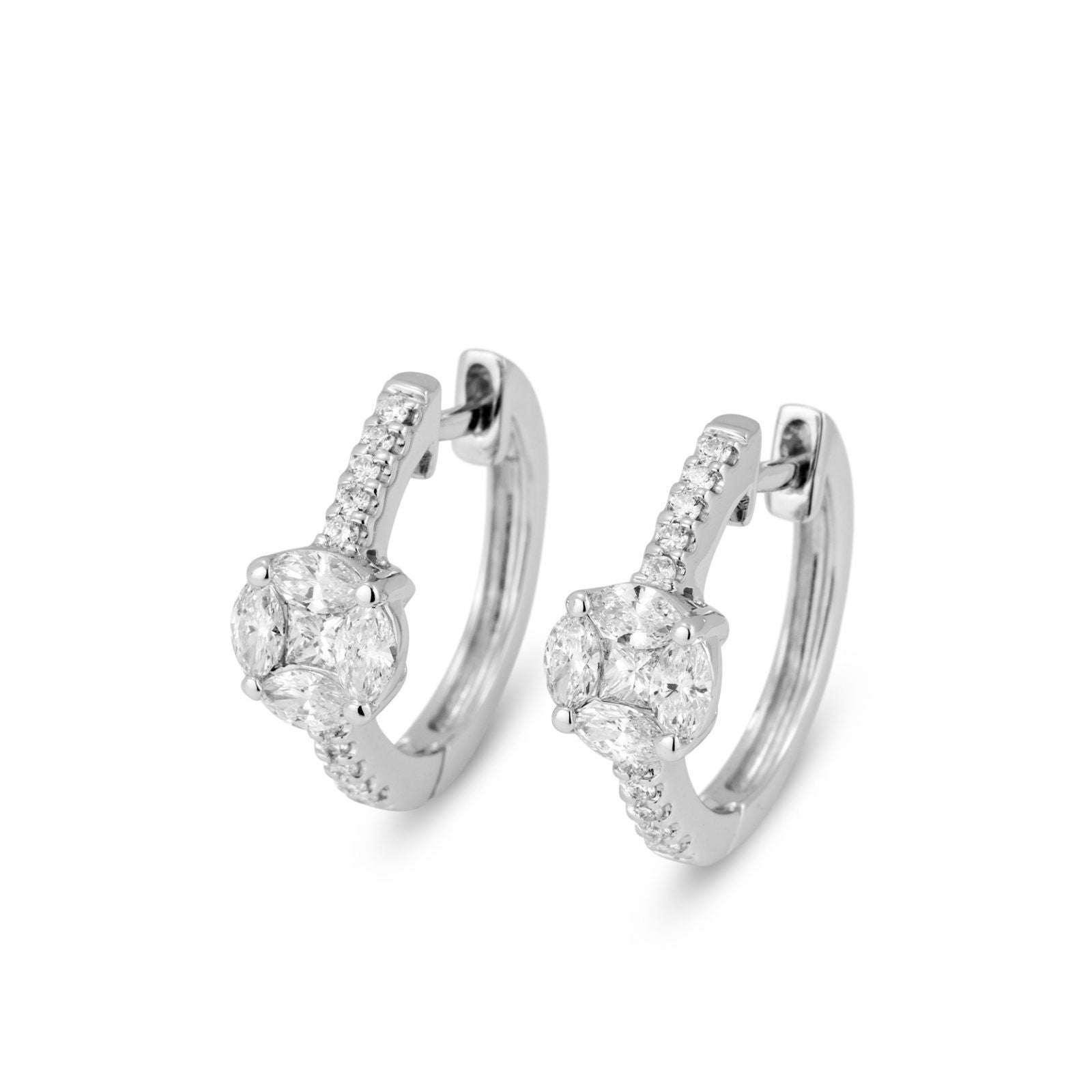 Orecchini design a cerchio realizzati in oro bianco 18kt e impreziositi con diamanti naturali centrali 0,48 ct e pavé di diamanti 0,12 ct. Perfetti per chi ama il cerchio classico ma con un tocco particolare e iconico.