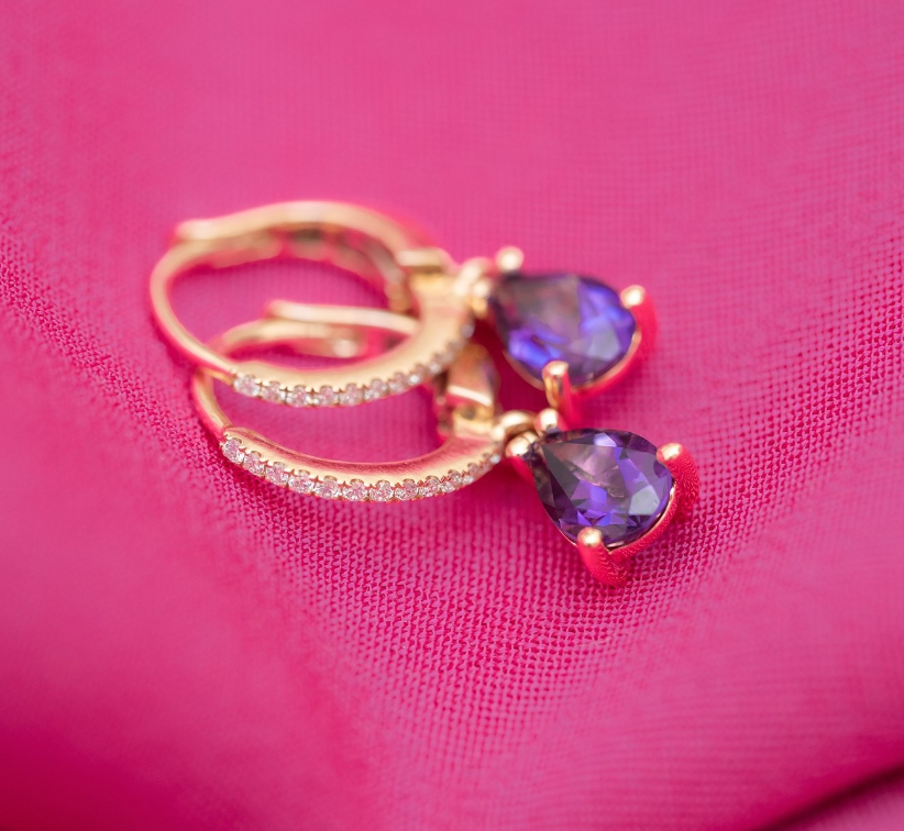 Orecchini realizzati in oro rosa 18kt con diamanti e ametiste pendenti