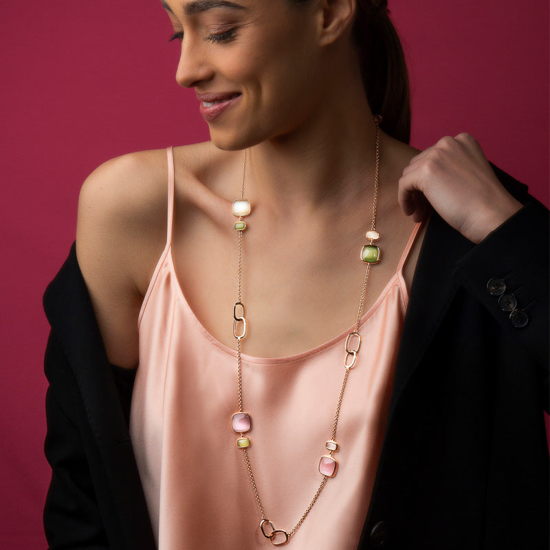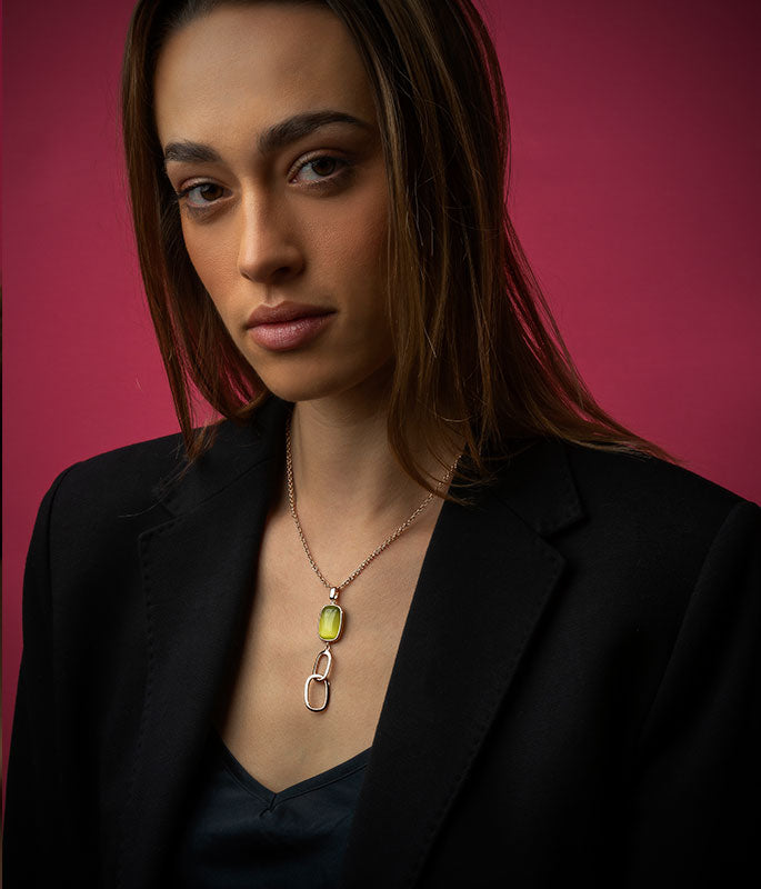 I gioielli Madi sono prodotti in Toscana, realizzati in Argento 925 con finiture in Oro rosé e meccanismi di chiusura di altissima qualità e durata. Elegante e raffinata, la collezione catene Lime si compone di più parure sulle tonalità del verde e del rosa.