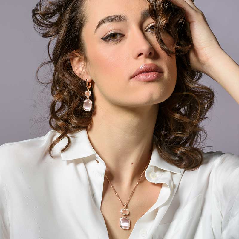 Orecchino realizzato in argento 925 con galvanica in oro rosa impreziosito con quarzi ecologici idrotermali e pave di zirconi
