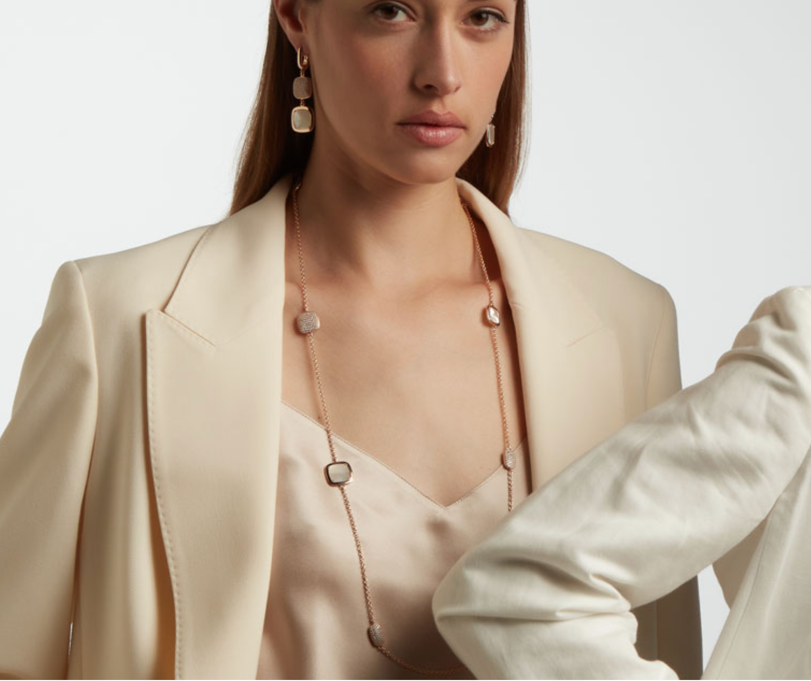 La forma iconica, con griffe a vista, esalta la Madreperla contornata da Argento 925 placcato Oro rosé.