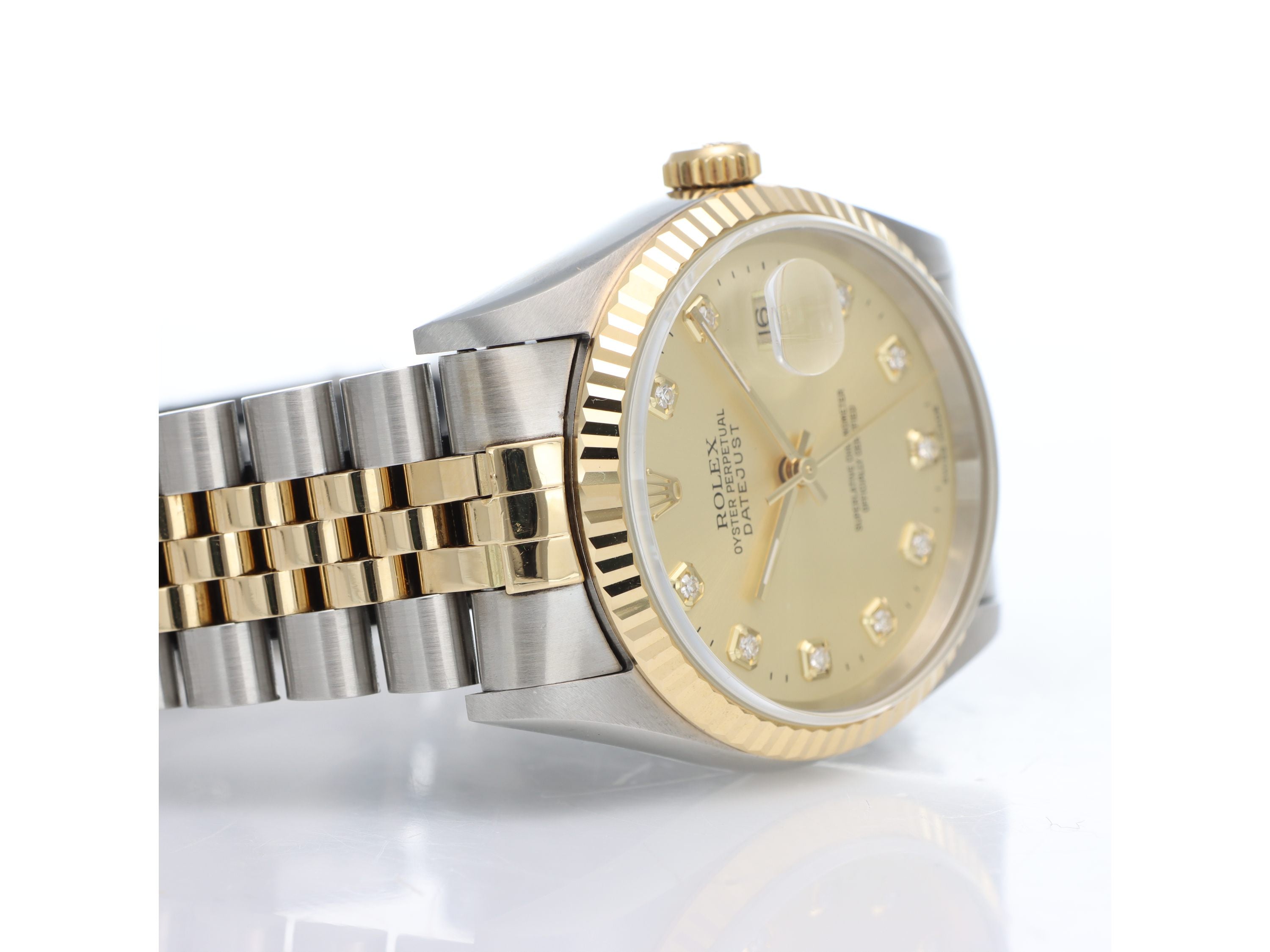 Rolex Datejust Ref. 16233 realizzato in acciaio e oro giallo, Quadrante champagne con indici in brillanti, Lunetta fissa zigrinata in oro giallo, Cassa di diametro 36mm, Corona di carica a vite, Datario ad ore 3. Bracciale modello jubilee in acciaio e oro giallo con chiusura a scatoletta. Orologio in condizioni eccellenti. Seriale U52XXXX. Anno 1998. Garanzia datata 2000.