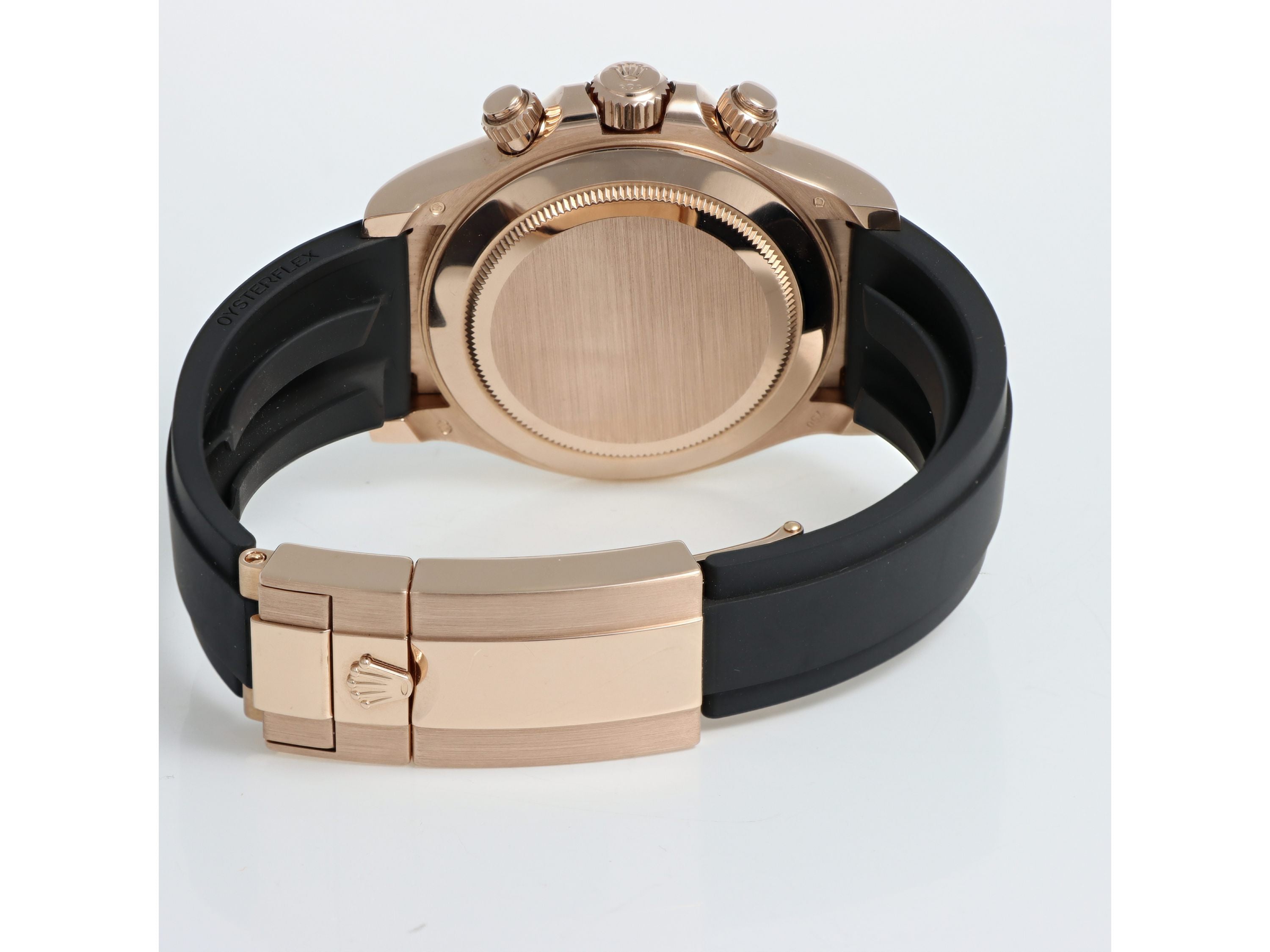 Rolex Daytona Ref. 116515LN realizzato in oro rosa 18 kt, quadrante sundust, lunetta in ceramica nera con scala tachimetrica 400, cassa di diametro 40 mm , corona di carica e pulsanti del chrono a vite, cinturino modello oysterflex nero. Orologio in condizioni eccellenti. Anno 2020. Card nuova. Full set.