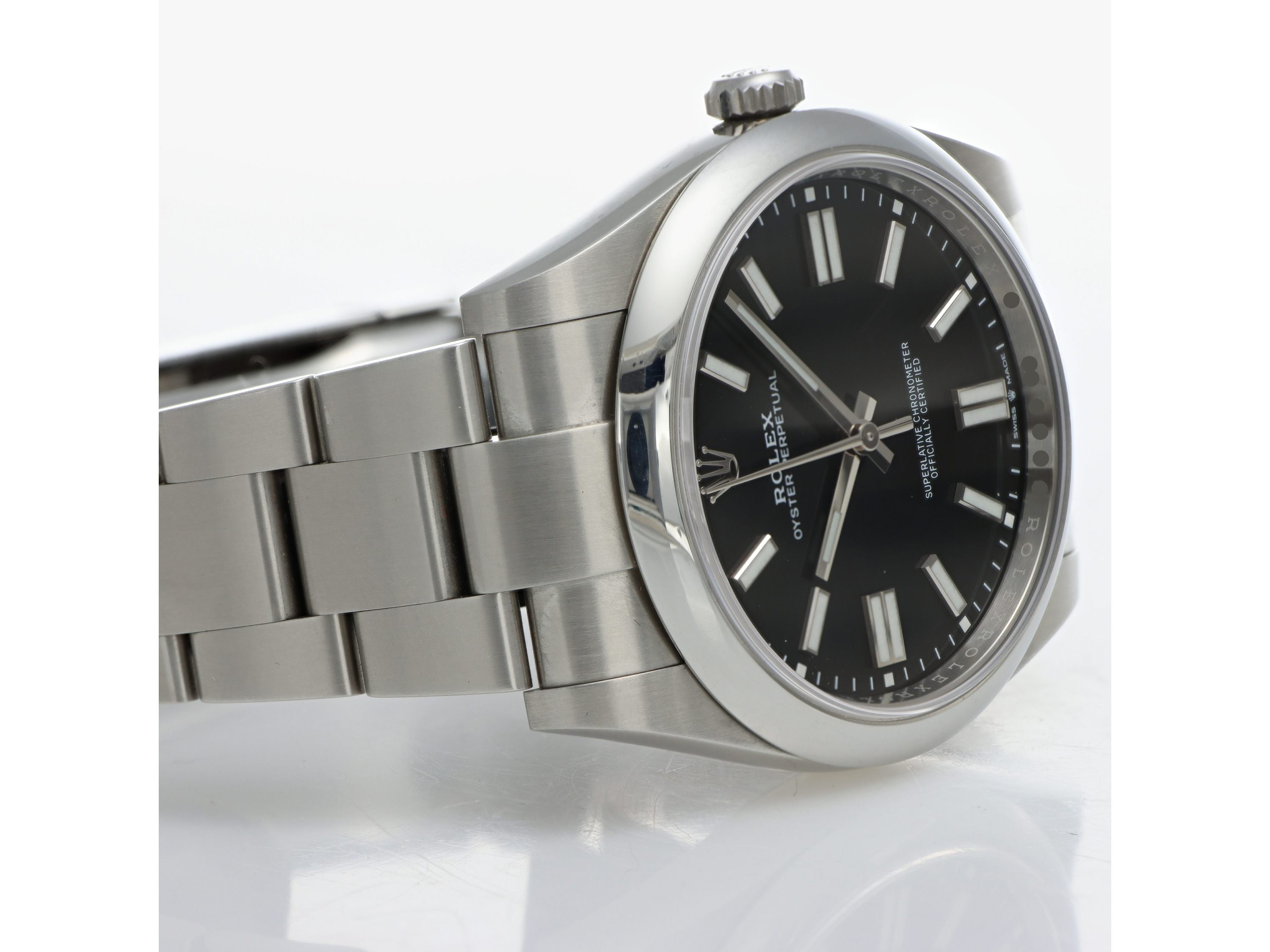 Rolex Oyster Perpetual Ref. 124300 realizzato in acciaio, Quadrante nero, Lunetta liscia in acciaio, Cassa di diametro 41 mm, Corona di carica a vite, Bracciale modello oyster in acciaio. Orologio in condizioni eccellenti. Garanzia datata 2023. Full Set.