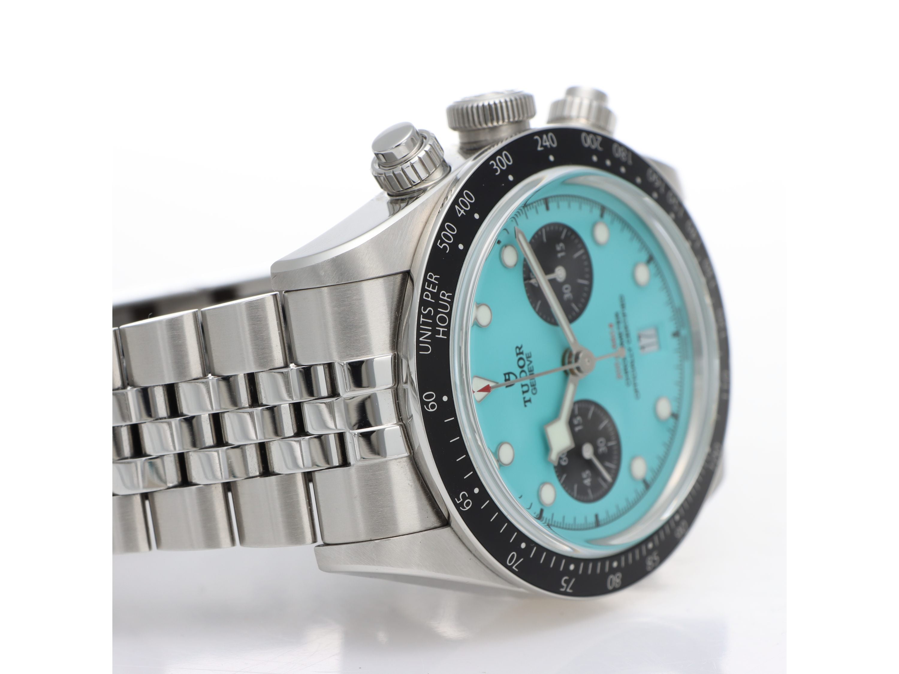 Tudor Black Bay Chrono Flamingo Blue Ref. 79360N realizzato in acciaio, Quadrante turchese blu con contatori neri, Lunetta fissa in acciaio con disco in alluminio nero opaco, Cassa di diametro 41mm. Corona di carica a vite in acciaio. Bracciale in acciaio satinato e lucido. Orologio in condizioni eccellenti. Garanzia datata 06/2025.