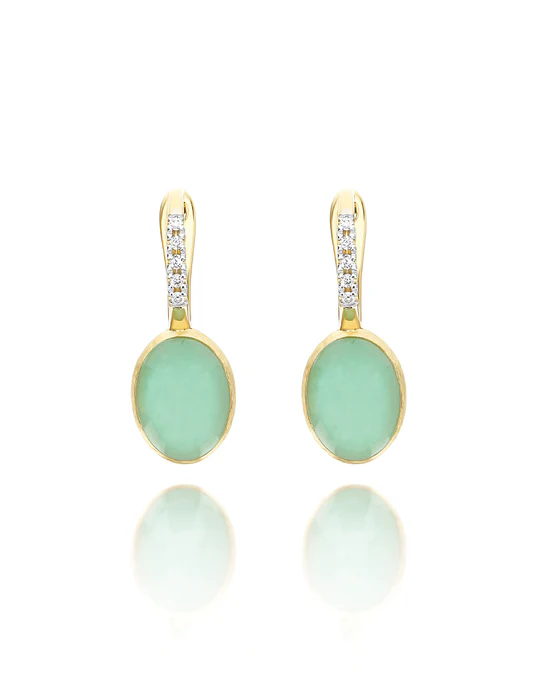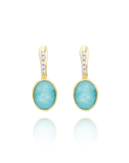 Orecchini Ciliegine Nanis Anice in oro inciso con diamanti, cristallo di rocca e Amazzonite (piccoli)